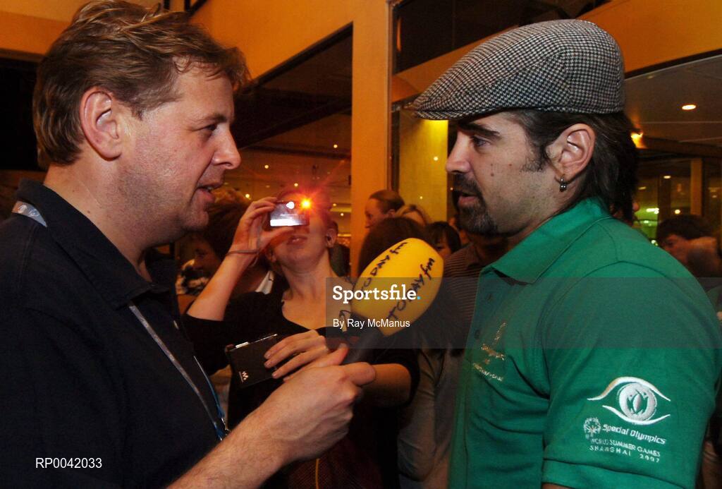 1 October 2007; Hollywood actor Colin Farrell is interviewed by Today FM's Ian Dempsey before attending a reception for Special Olympic Athletes and Volunteers. 2007 Special Olympics World Summer Games, Pearl Hotel, Shanghai, China. Picture credit: Ray McManus / SPORTSFILE