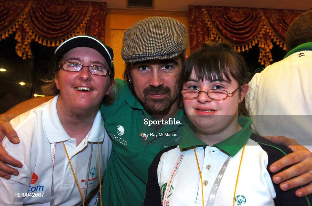 1 October 2007; Hollywood actor Colin Farrell with Sarah Kate Jordan, from Old Derrig, Carlow, and Lorraine Burke, from Speenoge, Donegal, at a reception for Special Olympic Athletes and Volunteers. 2007 Special Olympics World Summer Games, Pearl Hotel, Shanghai, China. Picture credit: Ray McManus / SPORTSFILE