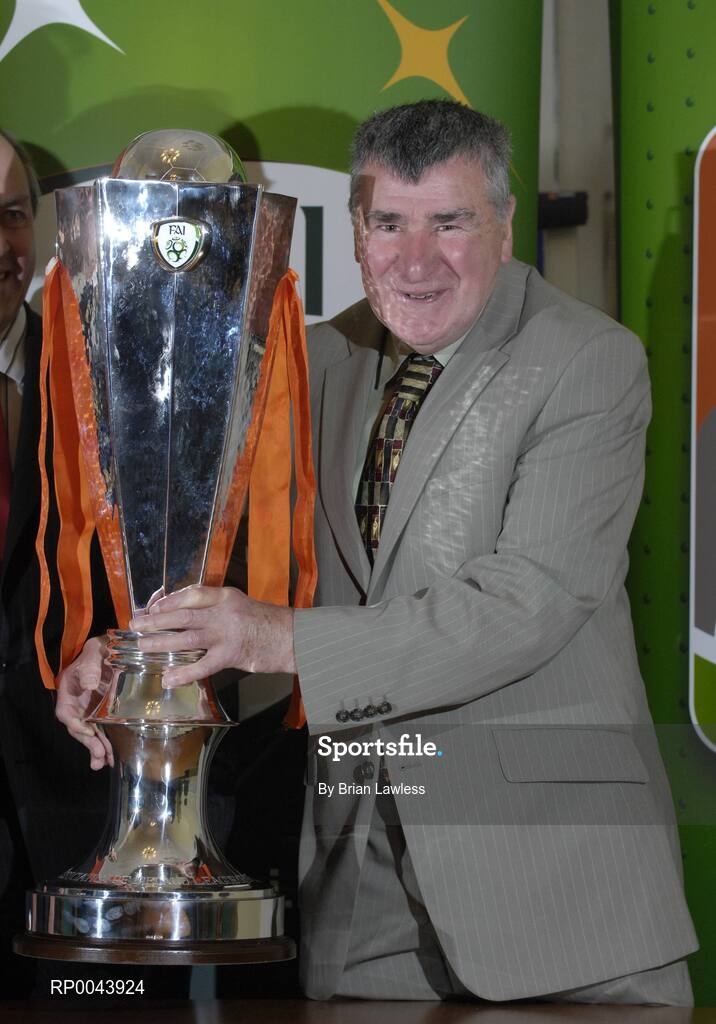 31 October 2007; The Football Association of Ireland today unveiled the new eircom League of Ireland Premier Division trophy, which will be presented to Premier Division champions Drogheda United this Friday 2nd of November. Standing at 36 inches in height and with a circumference of 33 inches, the Sterling Silver trophy boasts a stunning and unique design that will make it instantly recognisable to football fans across the country. At the unveiling is League of Ireland legend Jim McLaughlin. Football Association of Ireland, Merrion Square, Dublin. Picture credit: Brian Lawless / SPORTSFILE