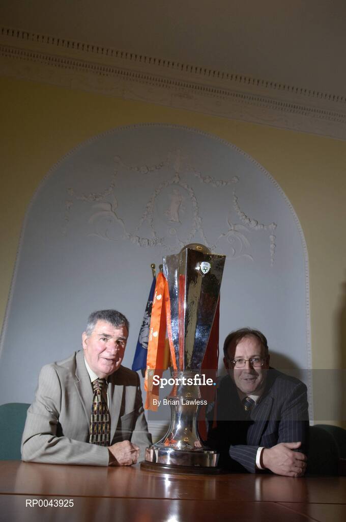 31 October 2007; The Football Association of Ireland today unveiled the new eircom League of Ireland Premier Division trophy, which will be presented to Premier Division champions Drogheda United this Friday 2nd of November. Standing at 36 inches in height and with a circumference of 33 inches, the Sterling Silver trophy boasts a stunning and unique design that will make it instantly recognisable to football fans across the country. At the unveiling are Fran Gavin, Director of the eircom League of Ireland, right, and League of Ireland legend Jim McLaughlin. Football Association of Ireland, Merrion Square, Dublin. Picture credit: Brian Lawless / SPORTSFILE