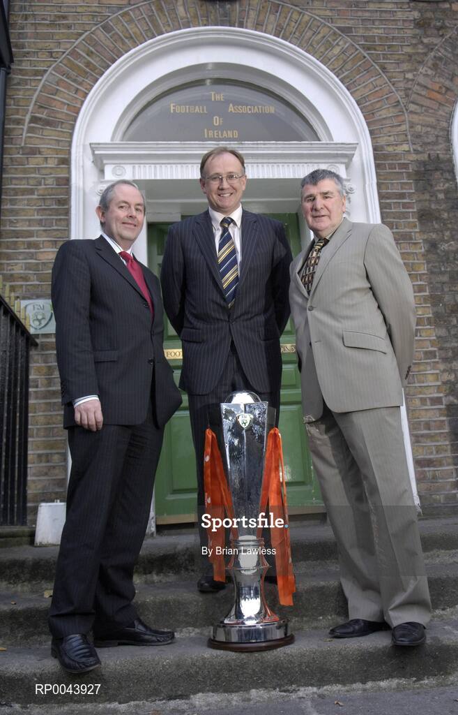 31 October 2007; The Football Association of Ireland today unveiled the new eircom League of Ireland Premier Division trophy, which will be presented to Premier Division champions Drogheda United this Friday 2nd of November. Standing at 36 inches in height and with a circumference of 33 inches, the Sterling Silver trophy boasts a stunning and unique design that will make it instantly recognisable to football fans across the country. At the unveiling are Fran Gavin, Director of the eircom League of Ireland, centre, League of Ireland legend Jim McLaughlin, and Padraig Corkery, Head of Sponsorship, eircom, left. Football Association of Ireland, Merrion Square, Dublin. Picture credit: Brian Lawless / SPORTSFILE