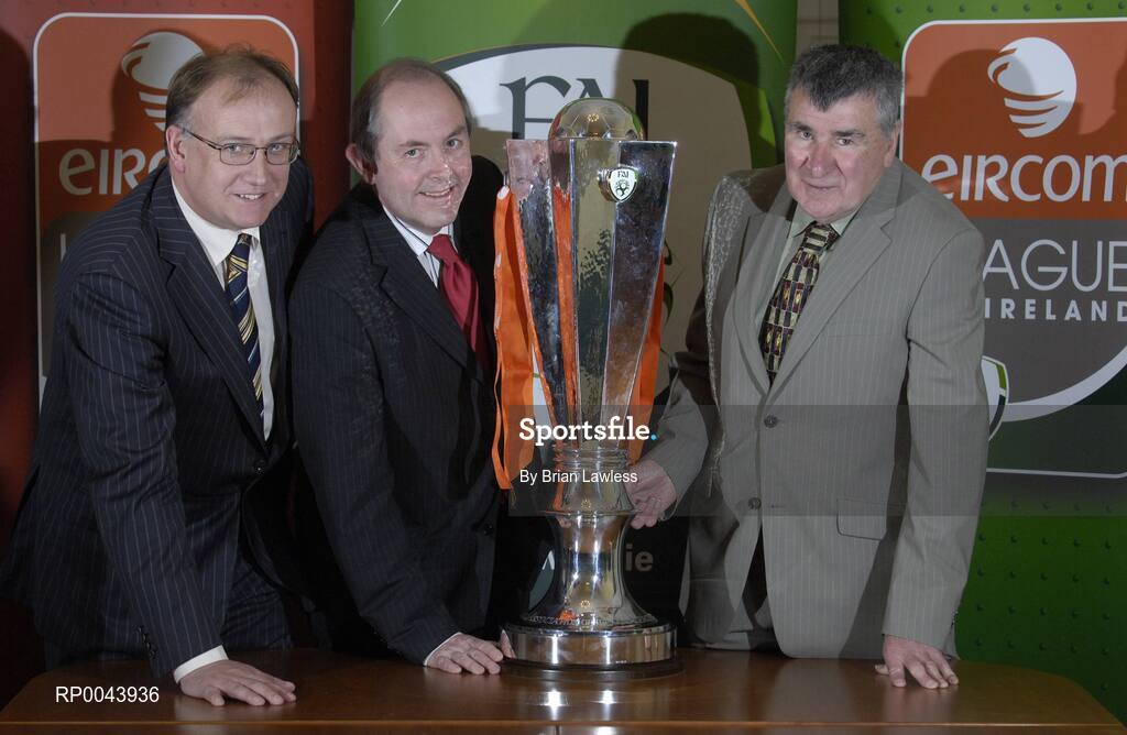 31 October 2007; The Football Association of Ireland today unveiled the new eircom League of Ireland Premier Division trophy, which will be presented to Premier Division champions Drogheda United this Friday 2nd of November. Standing at 36 inches in height and with a circumference of 33 inches, the Sterling Silver trophy boasts a stunning and unique design that will make it instantly recognisable to football fans across the country. At the unveiling are, from left, Fran Gavin, Director of the eircom League of Ireland, Padraig Corkery, Head of Sponsorship, eircom, and League of Ireland legend Jim McLaughlin. Football Association of Ireland, Merrion Square, Dublin. Picture credit: Brian Lawless / SPORTSFILE