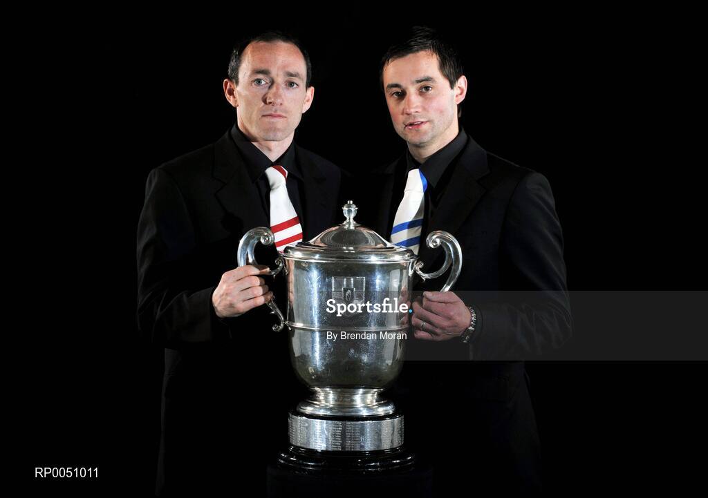 29 April 2008; At the launch of the GAA All-Ireland Senior Football Championship 2008, supported by Toyota, Vodafone and Ulster Bank, are, Tyrone captain Brian Dooher, left, with Monaghan captain damien Freeman and the Anglo Celt Cup. Croke Park, Dublin. Picture credit: Brendan Moran / SPORTSFILE
