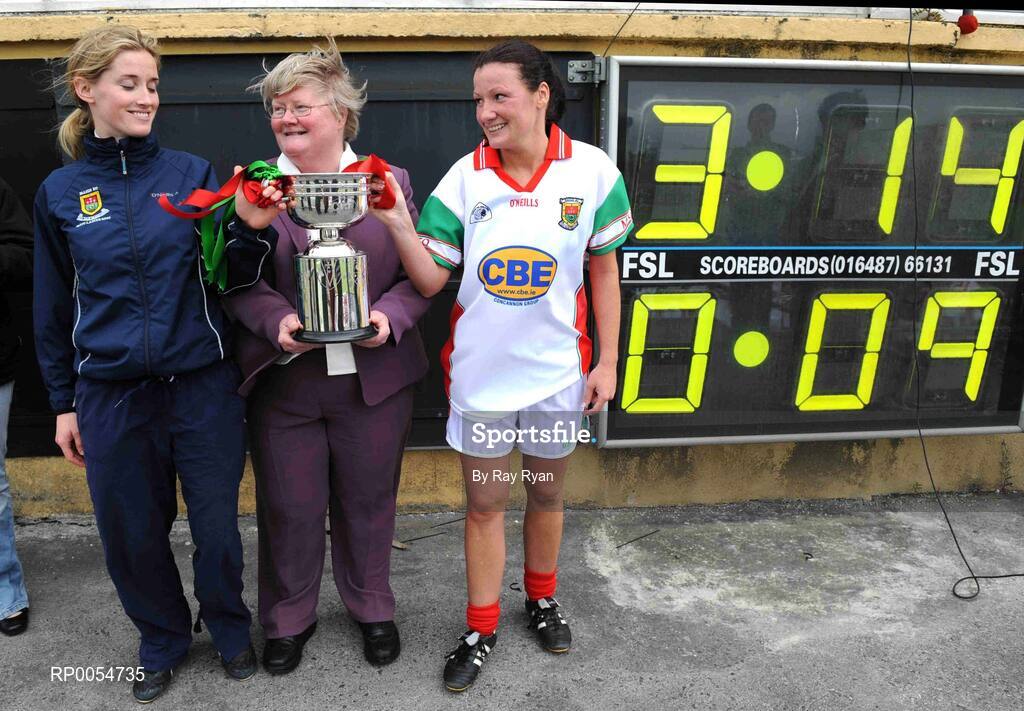6 July 2008; Mayo captain Claire O'Hara, left, and vice captain Marcella Heffernan accept the CBE cup from Ladies Football President Geraldine Carey. TG4 Connacht Ladies Senior Football Final, Mayo v Sligo, McHale Park, Castlebar, Co. Mayo. Picture credit: Ray Ryan / SPORTSFILE