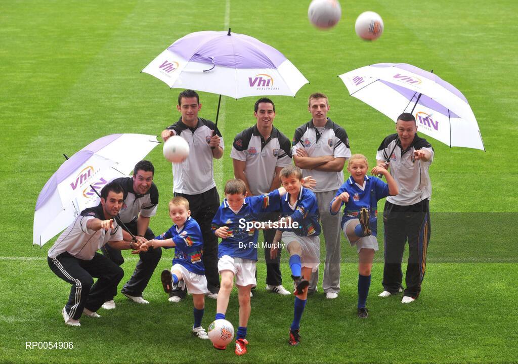 9 July 2008; The Vhi / GAA Cul Camps, the official GAA summer camps, got off to a flying start today with the launch of the Vhi Cul Camp Ambassadors. Pictured are young footballers, from left, Cian Franey, Conor Donohoe, Michael Donohoe, and Jennifer Gormley with inter-county stars and Vhi Cúl Camp Ambassadors, from left, Karl Lacey, Donegal, Cian Ward, Meath, Shane Lennon, Louth, Aaron Kernan, Armagh, Shane McGrath, Tipperary, and Leighton Glynn, Wicklow. The 2008 Vhi / GAA Cul Camp Ambassadors will visit camps nationwide, giving tips to children on how to improve their game and offering the children a unique opportunity to ask them individual questions on their sport. Croke Park, Dublin. Picture credit: Pat Murphy / SPORTSFILE