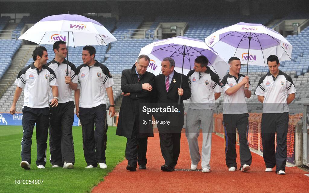 9 July 2008; The Vhi / GAA Cul Camps, the official GAA summer camps, got off to a flying start today with the launch of the Vhi Cul Camp Ambassadors. Pictured are from left, Karl Lacey, Donegal, Shane Lennon, Louth, Cian Ward, Meath, Jimmy Tolan, Chief Executive, VHI, Nickey Brennan, President of the GAA, Shane McGrath, Tipperary, Leighton Glynn, Wicklow and Aaron Kernan, Armagh. The 2008 Vhi Cúl Camp Ambassadors will visit camps nationwide, giving tips to children on how to improve their game and offering the children a unique opportunity to ask them individual questions on their sport. Croke Park, Dublin. Picture credit: Pat Murphy / SPORTSFILE