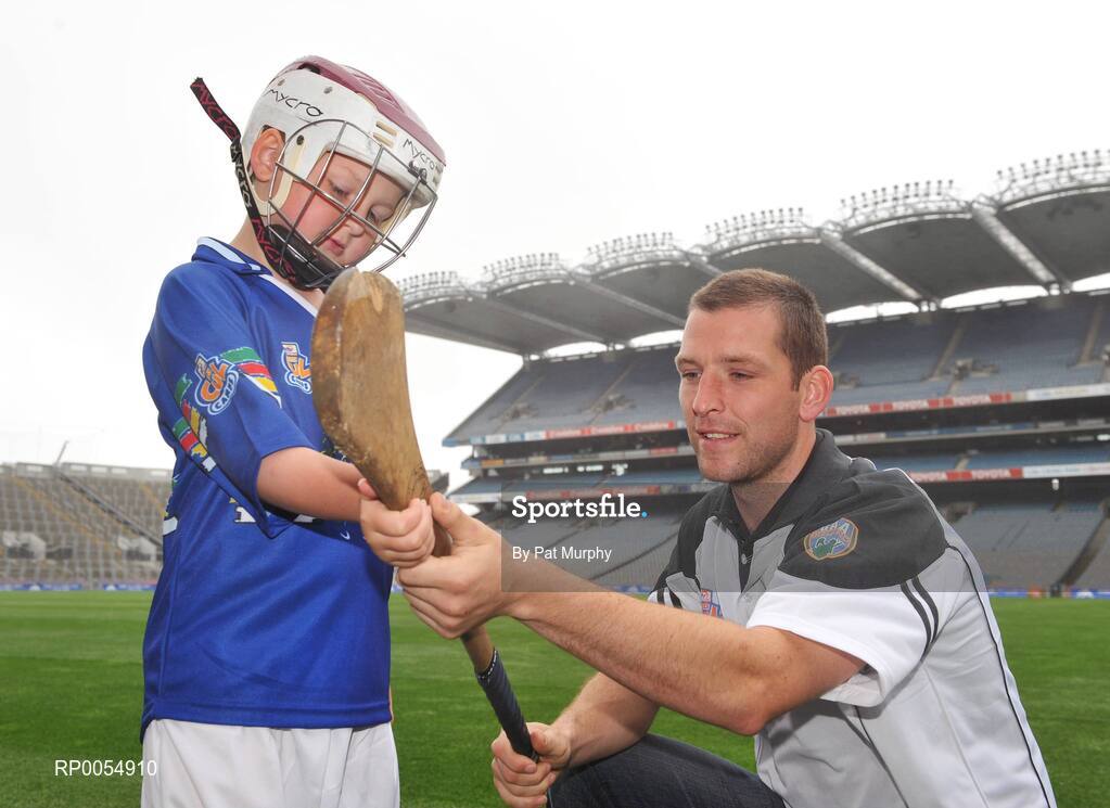 9 July 2008; The Vhi / GAA Cul Camps, the official GAA summer camps, got off to a flying start today with the launch of the Vhi Cul Camp Ambassadors. Pictured is young hurler Glenn Gormley, age 7, from Kilkenny with inter-county star and Vhi Cúl Camp Ambassador Ken McGrath, from Waterford. The 2008 Vhi Cúl Camp Ambassadors will visit camps nationwide, giving tips to children on how to improve their game and offering the children a unique opportunity to ask them individual questions on their sport. Croke Park, Dublin. Picture credit: Pat Murphy / SPORTSFILE