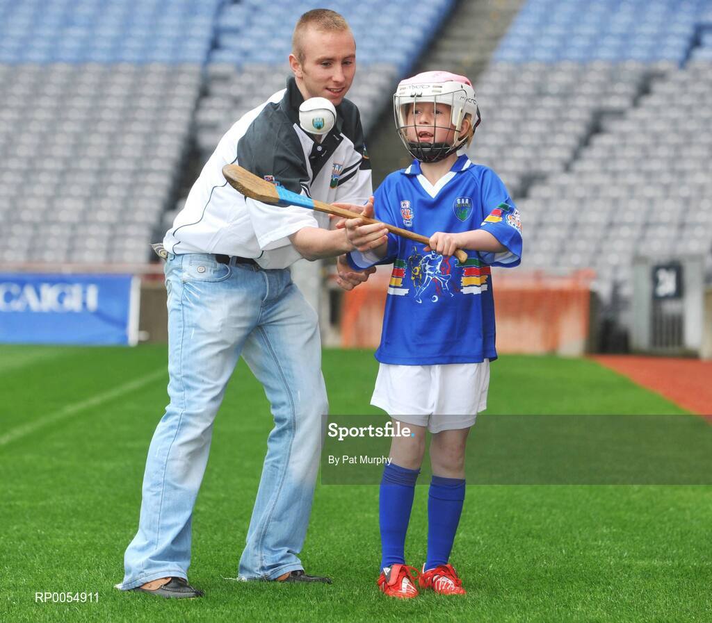9 July 2008; The Vhi / GAA Cul Camps, the official GAA summer camps, got off to a flying start today with the launch of the Vhi Cul Camp Ambassadors. Pictured are young hurler Sive Shelly, age 7, from Tipperary with inter-county star and Vhi Cúl Camp Ambassador James 'Cha' Fitzpatrick of Kilkenny. The 2008 Vhi Cúl Camp Ambassadors will visit camps nationwide, giving tips to children on how to improve their game and offering the children a unique opportunity to ask them individual questions on their sport. Croke Park, Dublin. Picture credit: Pat Murphy / SPORTSFILE