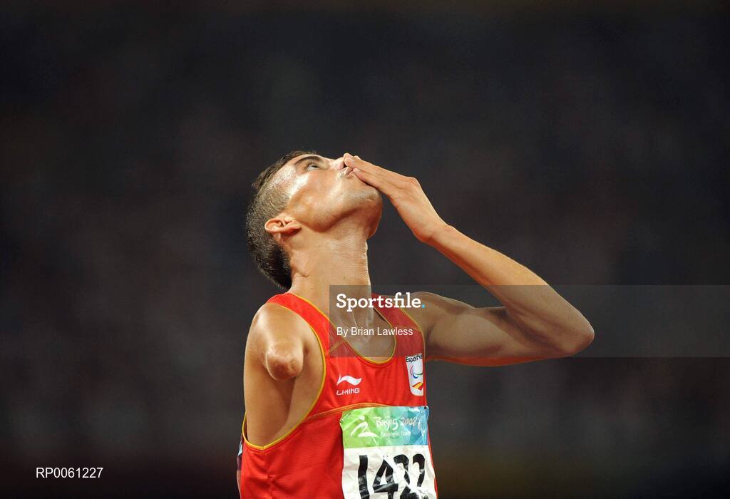 10 September 2008; Spain's Abderrahman Ait Khamouch celebrates finishing 2nd in the Men's 1500m - T46. Beijing Paralympic Games 2008, Men's 1500m - T46, National Stadium, Olympic Green, Beijing, China. Picture credit: Brian Lawless / SPORTSFILE