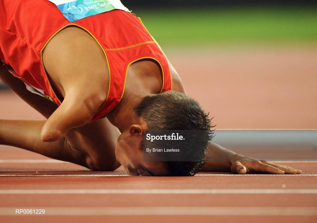 10 September 2008; Spain's Abderrahman Ait Khamouch celebrates finishing 2nd in the Men's 1500m - T46. Beijing Paralympic Games 2008, Men's 1500m - T46, National Stadium, Olympic Green, Beijing, China. Picture credit: Brian Lawless / SPORTSFILE
