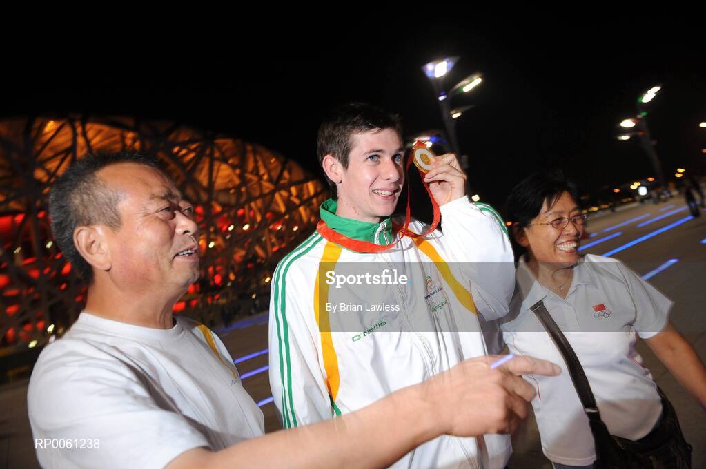 10 September 2008; Ireland's Michael McKillop, from Glengormley, Co. Antrim, celebrates with the Gold medal outside the 'Bird's Nest' after winning the Men's 800m - T37 in a World Record Time of 1:59.39. Beijing Paralympic Games 2008, Men's 800m - T37, National Stadium, Olympic Green, Beijing, China. Picture credit: Brian Lawless / SPORTSFILE