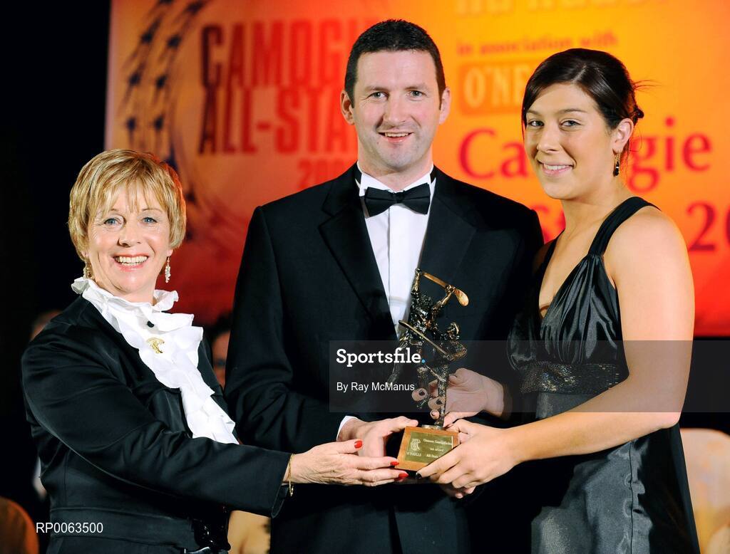 8 November 2008; Jessica Gill, of Galway, is presented with her Camogie All-Star Award by President of the Camogie Association Liz Howard and Guest of Honour - Tipperary hurler - Brendan Cummins. Camogie All-Star Awards 2008 in association with O’Neills, Citywest Hotel, Conference, Leisure & Golf Resort, Dublin. Picture credit: Ray McManus / SPORTSFILE