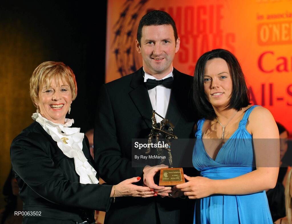 8 November 2008; Aoife Neary, of Kilkenny, is presented with her Camogie All-Star Award by President of the Camogie Association Liz Howard and Guest of Honour - Tipperary hurler - Brendan Cummins. Camogie All-Star Awards 2008 in association with O’Neills, Citywest Hotel, Conference, Leisure & Golf Resort, Dublin. Picture credit: Ray McManus / SPORTSFILE