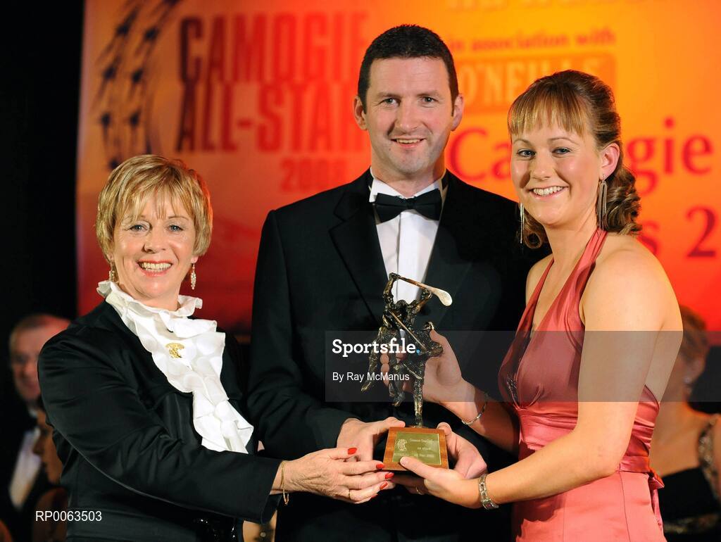 8 November 2008; Sile Burns, of Cork, is presented with her Camogie All-Star Award by President of the Camogie Association Liz Howard and Guest of Honour - Tipperary hurler - Brendan Cummins. Camogie All-Star Awards 2008 in association with O’Neills, Citywest Hotel, Conference, Leisure & Golf Resort, Dublin. Picture credit: Ray McManus / SPORTSFILE
