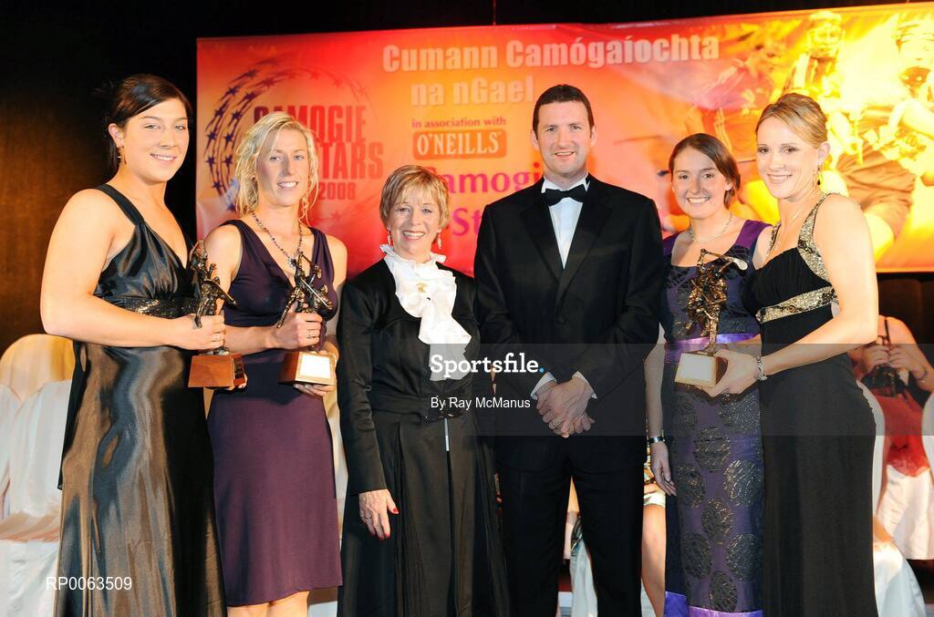 8 November 2008; Galway Camogie All-Star's, from left, Jessica Gill, Sinead Calahan and Therese Maher with President of the Camogie Association Liz Howardm Guest of Honour - Tipperary hurler - Brendan Cummins and Sinead O'Connor, Ard Stiurthoir of the Camogie Association, at the Camogie All-Star Awards 2008 in association with O’Neills, Citywest Hotel, Conference, Leisure & Golf Resort, Dublin. Picture credit: Ray McManus / SPORTSFILE