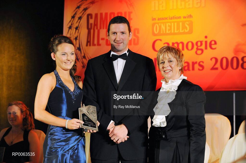 8 November 2008; Carina Roseingrave, of Clare, is presented with her Munster Young Camogie Player of the Year Award by President of the Camogie Association Liz Howard and Guest of Honour - Tipperary hurler - Brendan Cummins. Camogie All-Star Awards 2008 in association with O’Neills, Citywest Hotel, Conference, Leisure & Golf Resort, Dublin. Picture credit: Ray McManus / SPORTSFILE