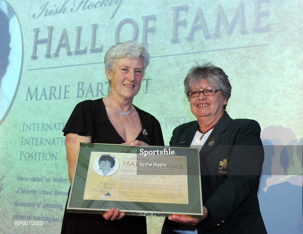 23 May 2009; Marie Bartlett, Catholic Institute, Limerick, is inducted into the Hall of Fame by IHA President Doreen Howe at the 2009 ESB Irish Hockey Awards. Burlington Hotel, Dublin. Picture credit: Pat Murphy / SPORTSFILE