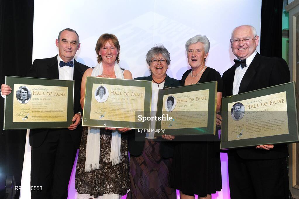 23 May 2009; IHA President Doreen Howe, centre, with Hall of Fame inductees, from left, John Clarke, Belfast YMCA, Lisnagarvey, Jenny Givan, Pegasus, Marie Bartlett, Catholic Instiitute, and Jonathan Cole, Avoca, YMCA, Trinity, at the 2009 ESB Irish Hockey Awards. Burlington Hotel, Dublin. Picture credit: Pat Murphy / SPORTSFILE