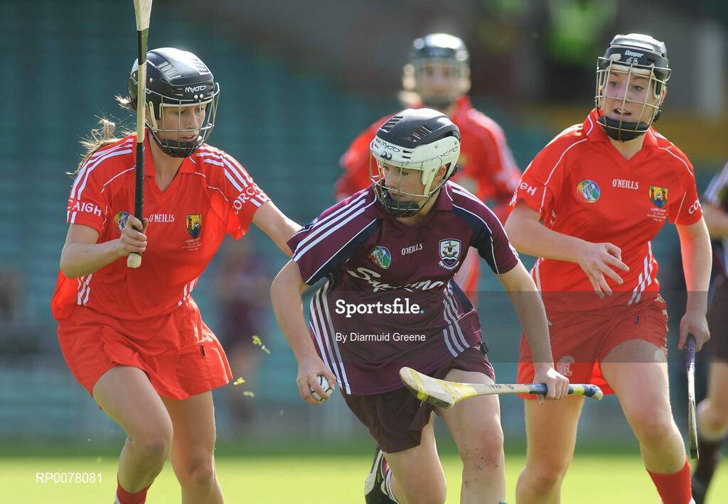 19 September 2009; Tara Rutledge, Galway, in action against Leah Weste, left, and Maria Walsh, Cork. Gala All-Ireland Intermediate Camogie Final, Cork v Galway, Cork v Galway, Gaelic Grounds, Limerick. Picture credit: Diarmuid Greene / SPORTSFILE