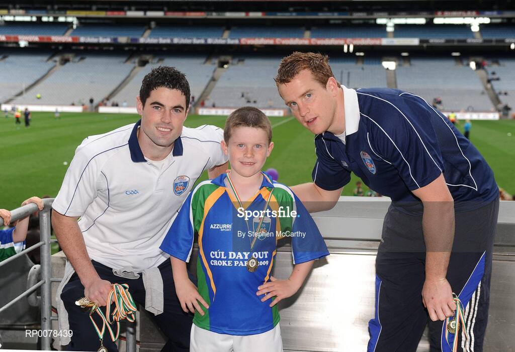 28 September 2009; 288 children from all over the country togged out today in the world-famous Croke Park stadium to attend the Vhi GAA Cúl Day Out. The 288 children were the lucky winners in the competition which was open to 82,500 children who attended a Vhi GAA Cúl Camp during the summer. Pictured after receiving her medal is Cian Murphy, from Lissiuigeen, from Killarney, Co. Kerry, with Vhi GAA Cúl Camps Ambassadors Dublin footballer Ross McConnell, left, and Cavan footballer Nicholas Walsh. Croke Park, Dublin. Picture credit: Stephen McCarthy / SPORTSFILE