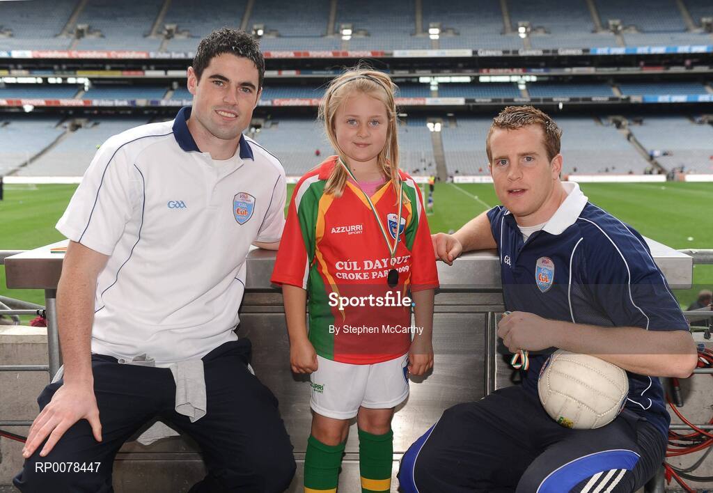 28 September 2009; 288 children from all over the country togged out today in the world-famous Croke Park stadium to attend the Vhi GAA Cúl Day Out. The 288 children were the lucky winners in the competition which was open to 82,500 children who attended a Vhi GAA Cúl Camp during the summer. Pictured after receiving her medal is Clodagh Joyce, from Reenascrena, Rosscarbery, Co. Cork, with Vhi GAA Cúl Camps Ambassadors Dublin footballer Ross McConnell, left, and Cavan footballer Nicholas Walsh. Croke Park, Dublin. Picture credit: Stephen McCarthy / SPORTSFILE