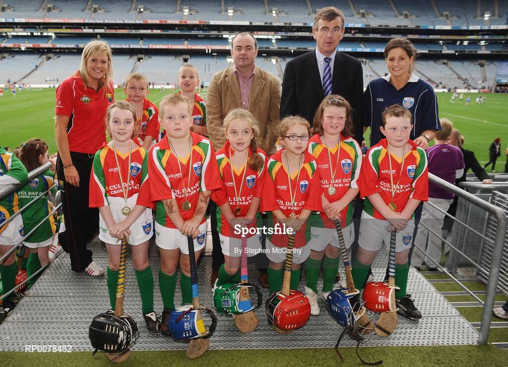 28 September 2009; Vhi GAA Cúl Day Out 2009, Cork ladies footballer Angela Walsh, former Meath footballer Colm O'Rourke, Dublin hurling manager Anthony Daly, and Wexford camogie player Mags D'Arcy. Croke Park, Dublin. Picture Credit: Stephen McCarthy / SPORTSFILE