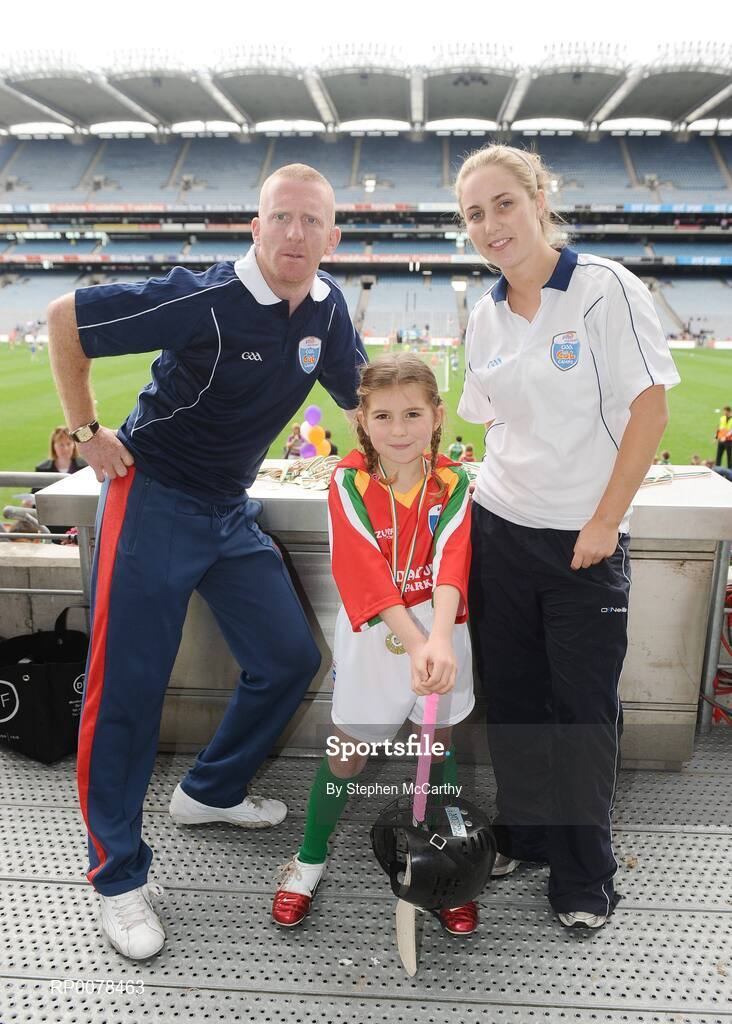 28 September 2009; 288 children from all over the country togged out today in the world-famous Croke Park stadium to attend the Vhi GAA Cúl Day Out. The 288 children were the lucky winners in the competition which was open to 82,500 children who attended a Vhi GAA Cúl Camp during the summer. Pictured after receiving her medal is Sinead Healy, from Gowran, Co. Kilkenny, with Vhi GAA Cúl Camps Ambassadors John Mullane, Waterford hurler, and Leanne Fennelly, Kilkenny camogie player. Croke Park, Dublin. Picture credit: Stephen McCarthy / SPORTSFILE