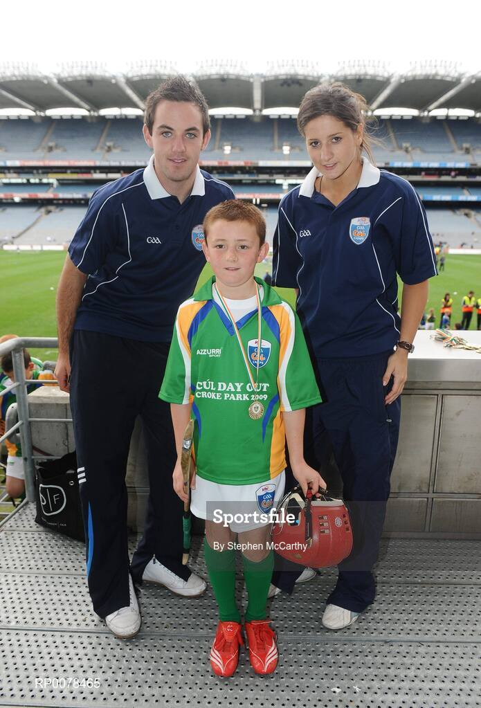 28 September 2009; 288 children from all over the country togged out today in the world-famous Croke Park stadium to attend the Vhi GAA Cúl Day Out. The 288 children were the lucky winners in the competition which was open to 82,500 children who attended a Vhi GAA Cúl Camp during the summer. Pictured after receiving his medal is James Lanigan, from Croagh, Co. Limerick, with Vhi GAA Cúl Camps Ambassadors Tomás Brady, Dublin hurler, and Mags D'Arcy, Wexford camogie player. Croke Park, Dublin. Picture credit: Stephen McCarthy / SPORTSFILE