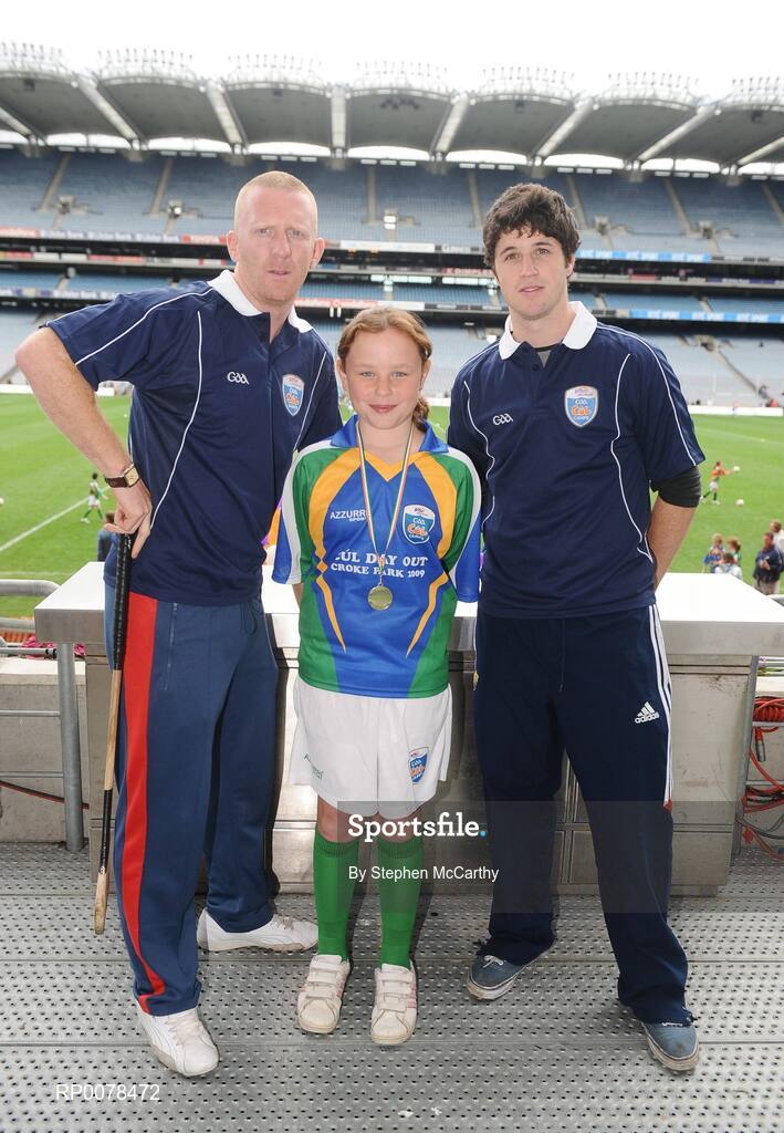 28 September 2009; 288 children from all over the country togged out today in the world-famous Croke Park stadium to attend the Vhi GAA Cúl Day Out. The 288 children were the lucky winners in the competition which was open to 82,500 children who attended a Vhi GAA Cúl Camp during the summer. Pictured after receiving his medal is Rachel McNamara, from Mullingar, Co. Westmeath, with Vhi GAA Cúl Camps Ambassadors John Mullane, Waterford hurler, left, and David Treacy, Dublin hurler. Croke Park, Dublin. Picture credit: Stephen McCarthy / SPORTSFILE