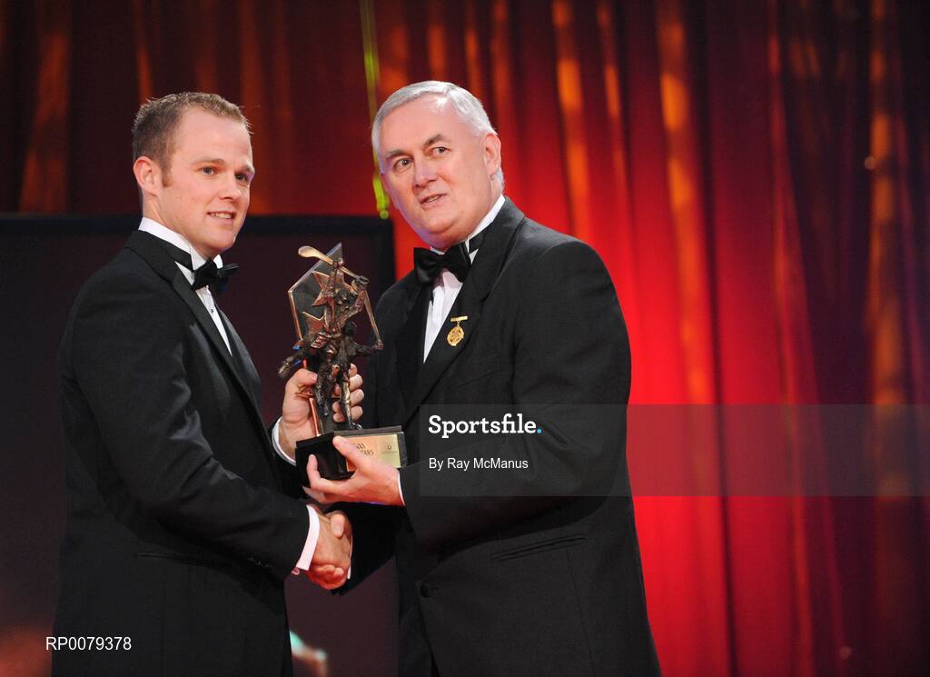16 October 2009; Tommy Walsh, of Kilkenny, is presented with his GAA Hurling All-Star award by Uachtarán CLG Criostóir Ó Cuana during the 2009 GAA All-Stars Awards, sponsored by Vodafone. Citywest Hotel, Conference, Leisure & Golf Resort, Dublin. Picture credit: Ray McManus / SPORTSFILE