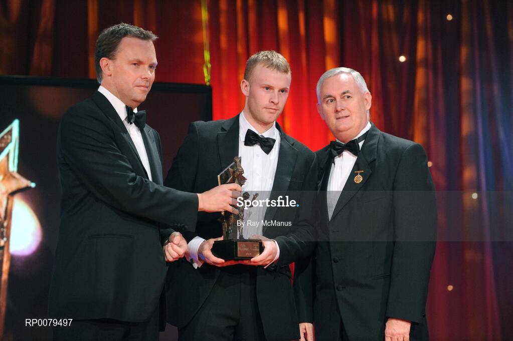 16 October 2009; Michael Shields, of Cork, is presented with his GAA Football All-Star award by Uachtarán CLG Criostóir Ó Cuana and Charles Butterworth, CEO Vodafone Ireland, during the 2009 GAA All-Stars Awards, sponsored by Vodafone. Citywest Hotel, Conference, Leisure & Golf Resort, Dublin. Picture credit: Ray McManus / SPORTSFILE