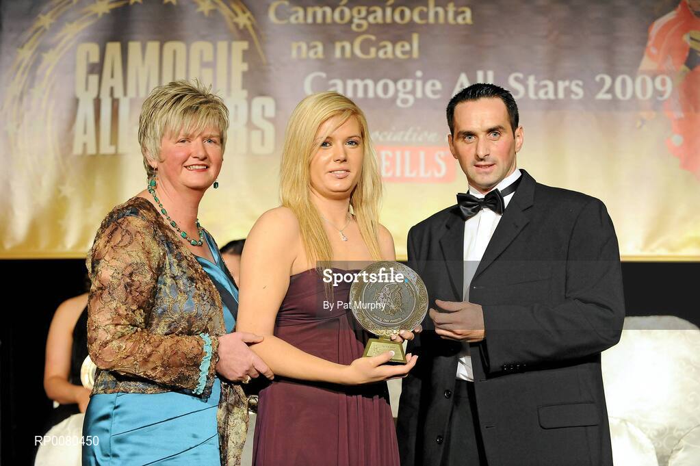 7 November 2009; Eimear Moynan, Laois, is presented with her Camogie Soaring Star award by Joan O'Flynn, President of the Camogie Association, and Paul Brady, three times World Handball Champion, during the 2009 Camogie Soaring Star Awards, in association with O'Neills. Citywest Hotel, Conference, Leisure & Golf Resort, Dublin. Picture credit: Pat Murphy / SPORTSFILE
