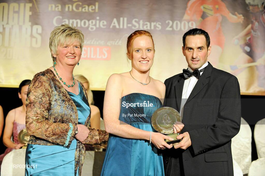 7 November 2009; Karen Brady, Offaly, is presented with her Camogie Soaring Star award by Joan O'Flynn, President of the Camogie Association, and Paul Brady, three times World Handball Champion, during the 2009 Camogie Soaring Star Awards, in association with O'Neills. Citywest Hotel, Conference, Leisure & Golf Resort, Dublin. Picture credit: Pat Murphy / SPORTSFILE